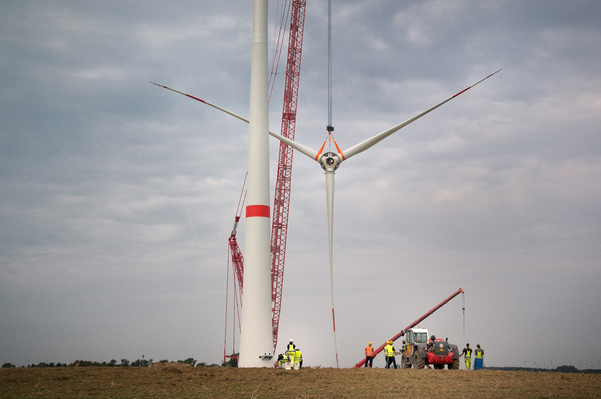 A construction crane lifts all three rotor blades of a wind turb
